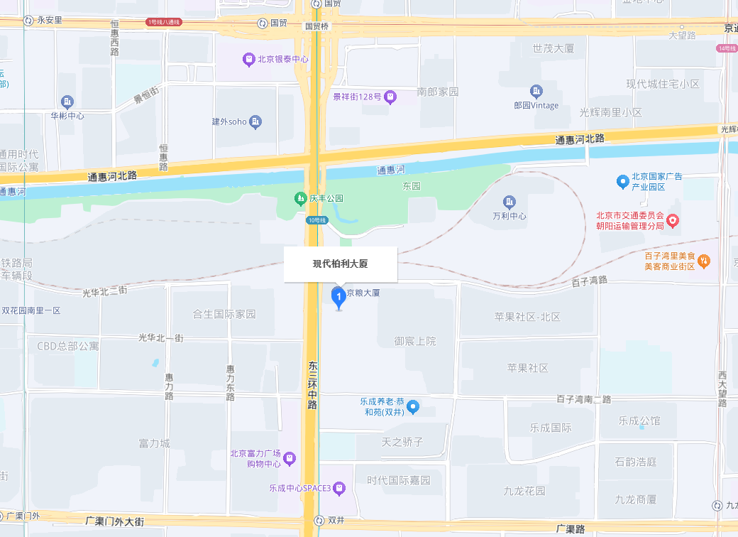 现代柏利大厦地址位于朝阳区东三环中路12号,雄踞CBD商务中心区(更多CBD写字楼出租信息),面临东三环路,东临四环路,北抵长安街,西通北京站,南达双井立交桥,沿东四环距机场高速路仅15分钟车程。交通极其便利,多条公交线路通过。商务设施齐全,周边分布有餐饮、超市、酒店等配套设施。便利的交通环境无疑是现代办公之首选。